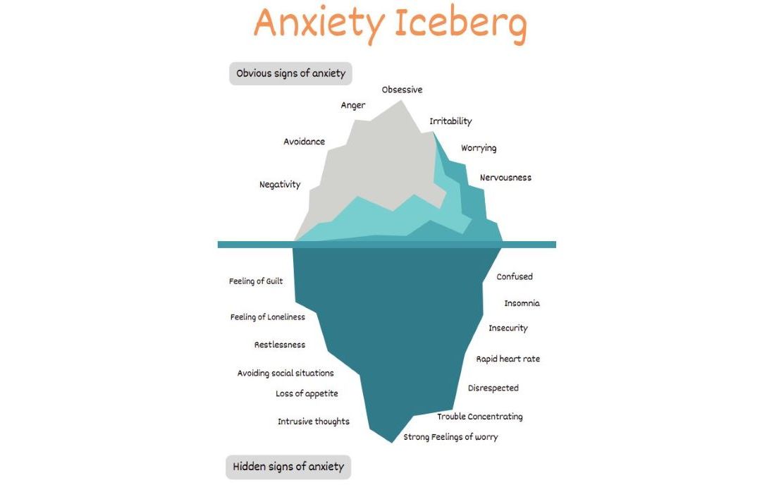 We may recognise the obvious signs of anxiety in ourselves or in others but some people are good at hiding it and put on a brave face. Like the iceberg, only 10% is above the surface while 90% remains hidden.