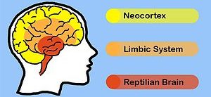 The stages of brain evolution are explained by "The Triune Brain" concept, described by Neuroscientist, Paul MacLean, in the 1960's. This idea is used in psychiatry to explain our psychological processes. It is not a biological representation however, and is purely used to simplify a very complicated system. McLean talks about 3 very distinct parts to the brain which he collectively calls "The Triune Brain" (shown below).